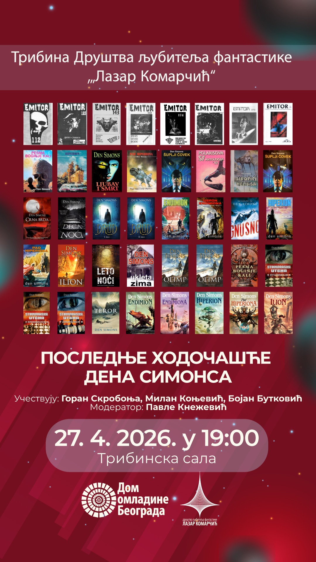 Окупљамо се да прођемо кроз његову каријеру, утицај и траг који је оставио за собом. Симонс је био истински мајстор и научне фантастике и хорора, као и историјских романа, али за себе је без скромности говорио да се најбоље сналази у жанру „бестселера“. Дођите, учествујте, али знамо да неће бити могуће бити речитији од једног од Симонсових најбољих ликова, Мартина Силенуса. Од писца ћемо се опростити са мало више речи, али признајемо, са мање моћи него стари песник.